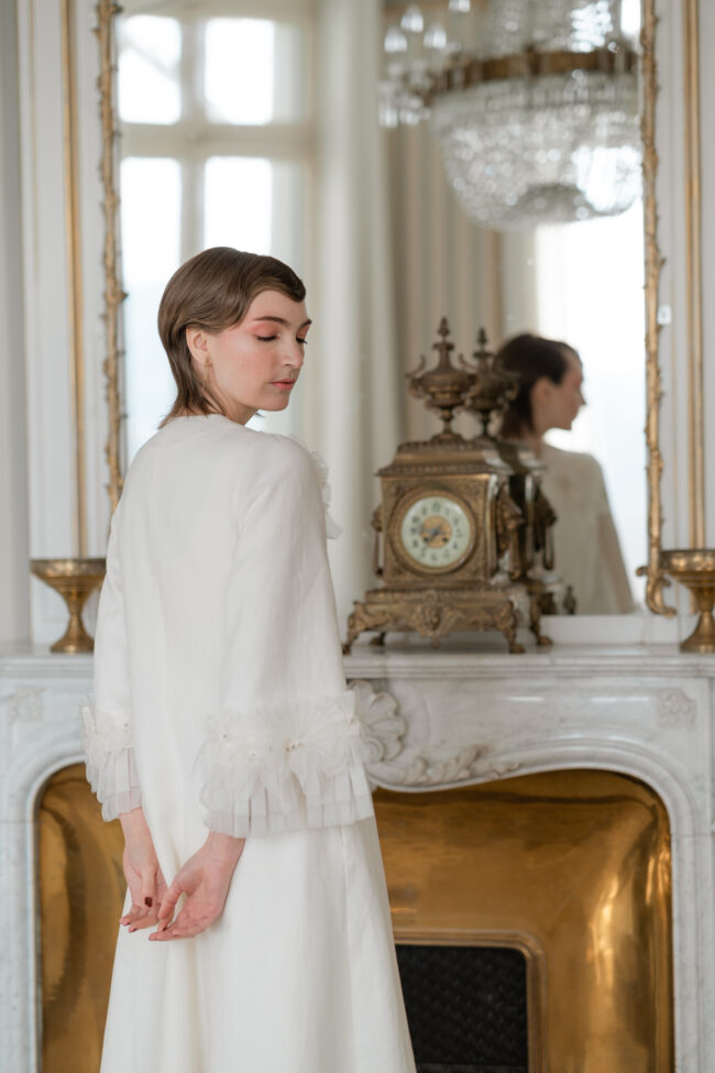 Mariko KIEFFER, qui est également vidéaste, a suivi la création des deux pièces emblématiques de la collection : la parure d’épaules PEGASE, et le manteau en lin ORION.
