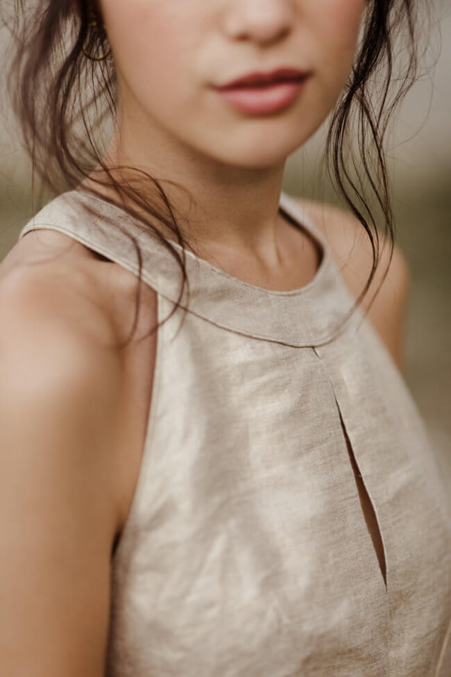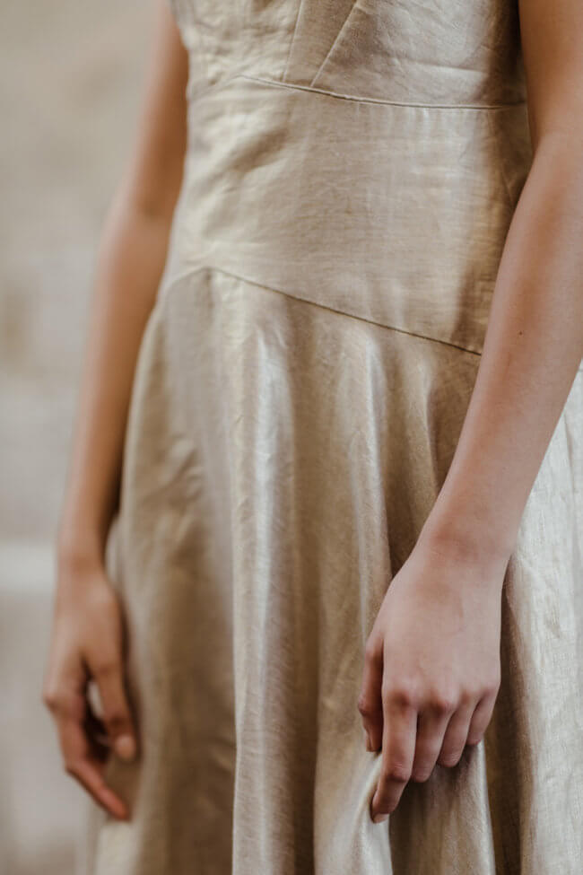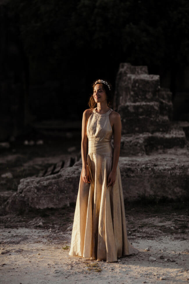 Inspirée par les beaux drapés de l’antiquité grecque, la collection emprunte également les codes graphiques de la période Art Déco, chère à la créatrice : silhouettes sculpturales, coupes ajustées, détails couture… le tout rehaussé par des matières sublimes et éco-responsables.